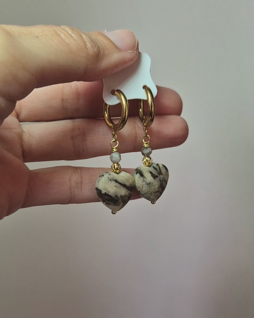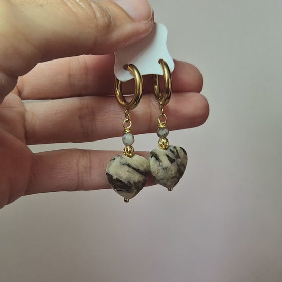 ✨ Boucles d’oreilles élégantes ornées de pierre de feldspath aux nuances sable et marbrées, rappelant la douceur des dunes et la chaleur de la terre.